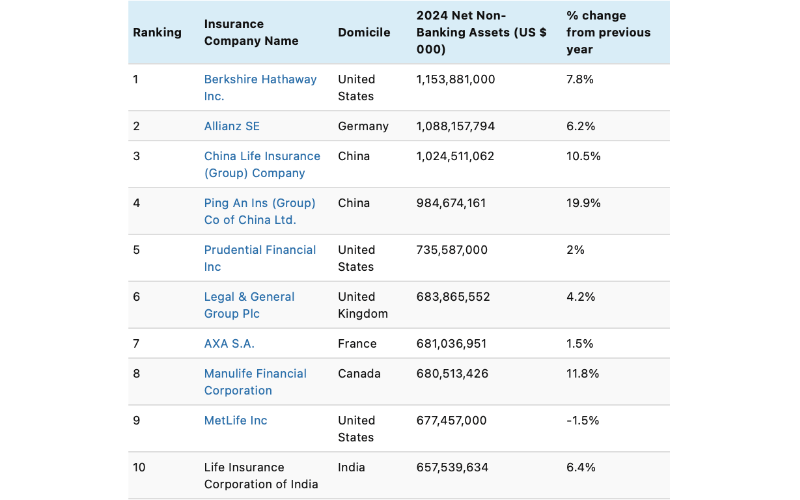 In terms of the world’s top 25 insurers ranked by 2024 net non-banking assets, Berkshire Hathaway Inc. took the top spot from Allianz SE, reporting assets of $1.15 trillion, up 7.8% year over year. Allianz fell to second from first in 2023, with $1.09 trillion in assets, up 6.2%.