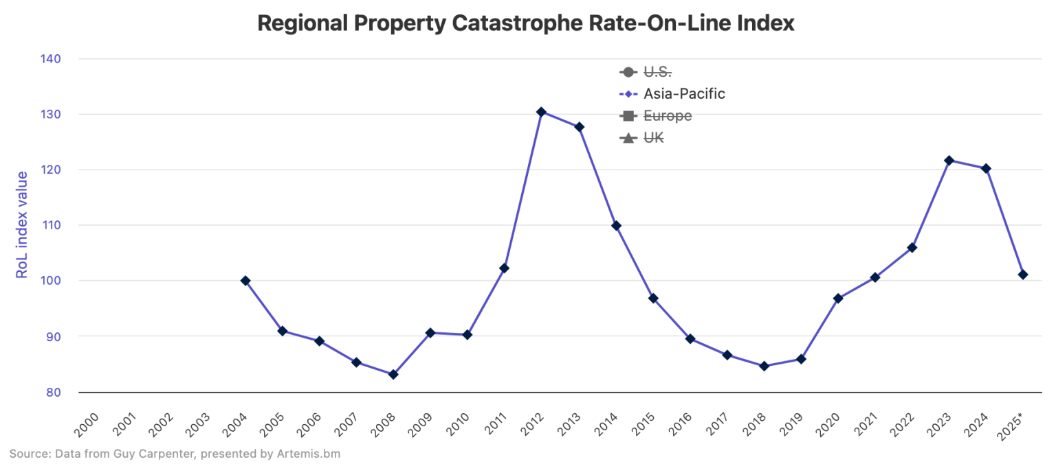 Elsewhere, Guy Carpenter’s APAC Property Catastrophe Reinsurance Rate-on-Line Index has declined by 15.9% as of July 2025, following a 7.2% drop at the January 1st renewals.