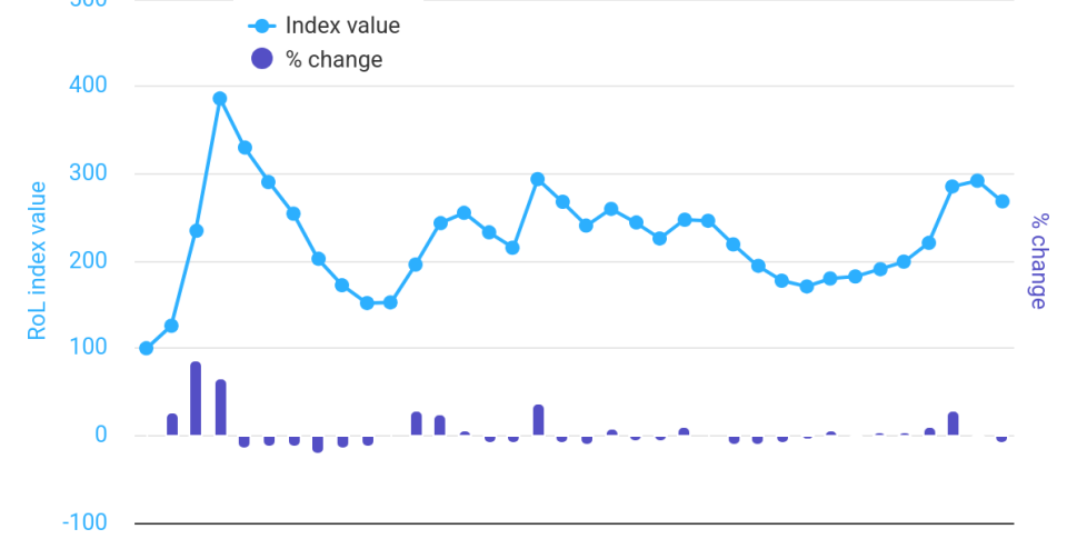 Again, the Guy Carpenter U.S. Property Rate on Line Index can be analysed using Artemis’ interactive chart.