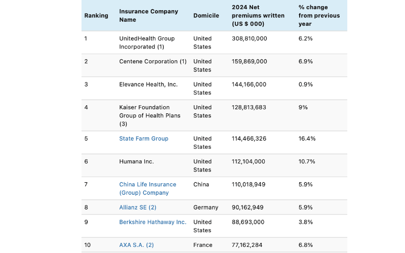 US health insurance companies continued to dominate the ranking of the world’s largest insurers in terms of 2024 net premiums written (NPW), with UnitedHealth Group Inc. maintaining its top spot, reporting $308.81 billion in NPW, an increase of 6.2% year over year.